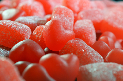 A pile of assorted gummi and gum drop hearts-shaped candies. The focal point is a single gummi heart at the center. All candies are red.