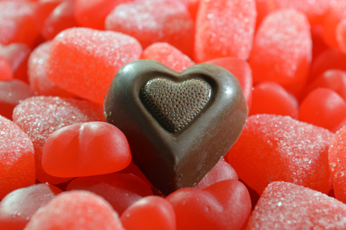 A pile of assorted gummi and gum drop hearts-shaped candies. The focal point is a single chocolate heart at the center. All candies are red except the chocolate.