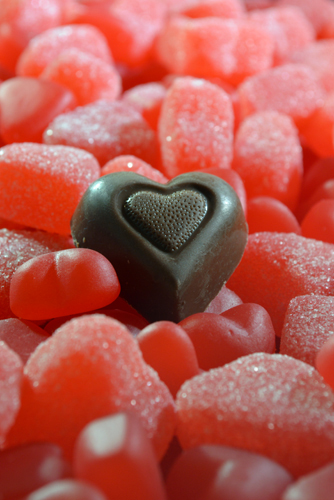 A pile of assorted gummi and gum drop hearts-shaped candies. The focal point is a single chocolate heart at the center. All candies are red except the chocolate.