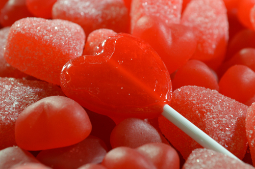 A pile of assorted gummi and gum drop hearts-shaped candies. The focal point is a single lollipop at the center. All candies are red.