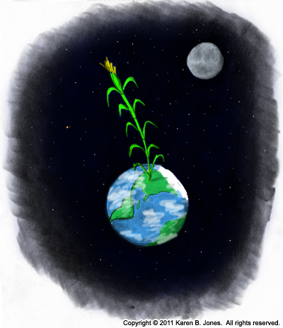 An cartoon illustration of the Earth seen from space.  The planet has been distorted into a heart-shape.  The sun is setting on the northwest/upper left and the moon is rising on the southeast/lower right.  There are stars in the void.