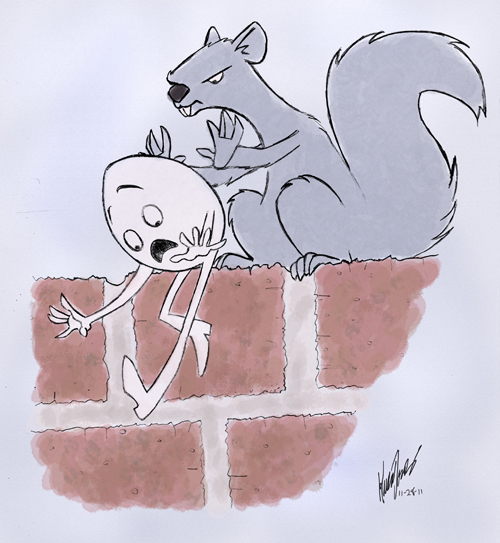 My most recent project has been illustrating a book for Jean Ball-Maurer titled Rocky The Human Squirrel. It’s a short, illustrated chapter book. I did the color cover (front and back) and 10 black and white interior illustrations.